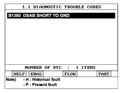 1) Displaying nothing (no DTC) or DTC with label "H" (historical) shows that Fault is intermittent caused by poor contact in the part's and/or SRSCM connector or was repaired and SRSCM memory was not cleared.