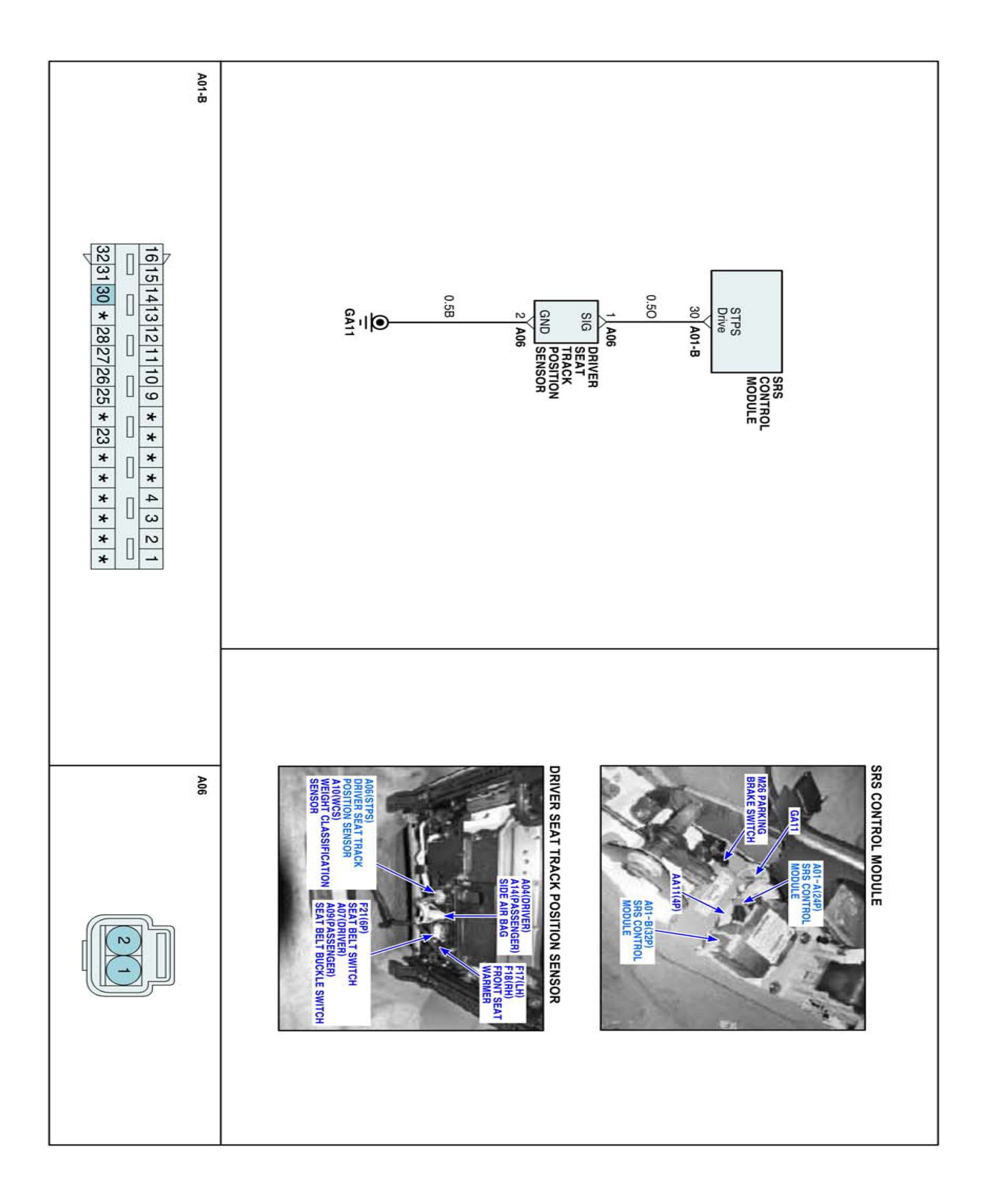 STPS located underneath driver seat detects horizontal position of driver seat and delivers it to SRSCM. Signal of STPS is the one of major parameters that determine the way dual output type airbag deploys.
