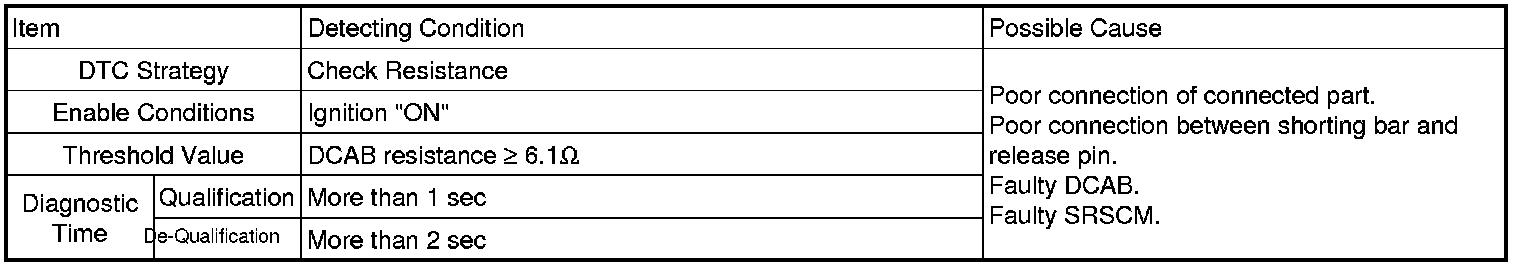 The SRSCM sets DTC B1473 if the measured resistance value of DCAB circuit is more than the threshold value.