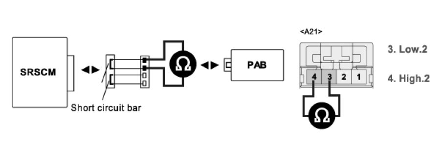4. Measure resistance between terminal "3" and "4" of the PAB harness connector.