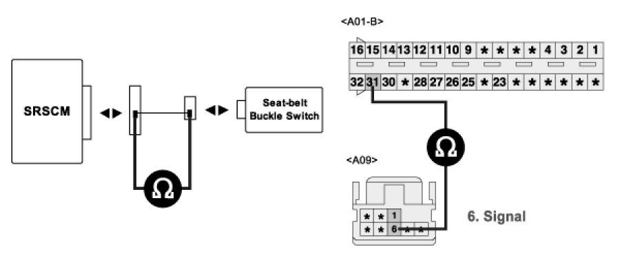 4. Measure resistance value between terminal "31" of main harness of SRSCM (A01-B) and "6" of harness of SBBS (A09).