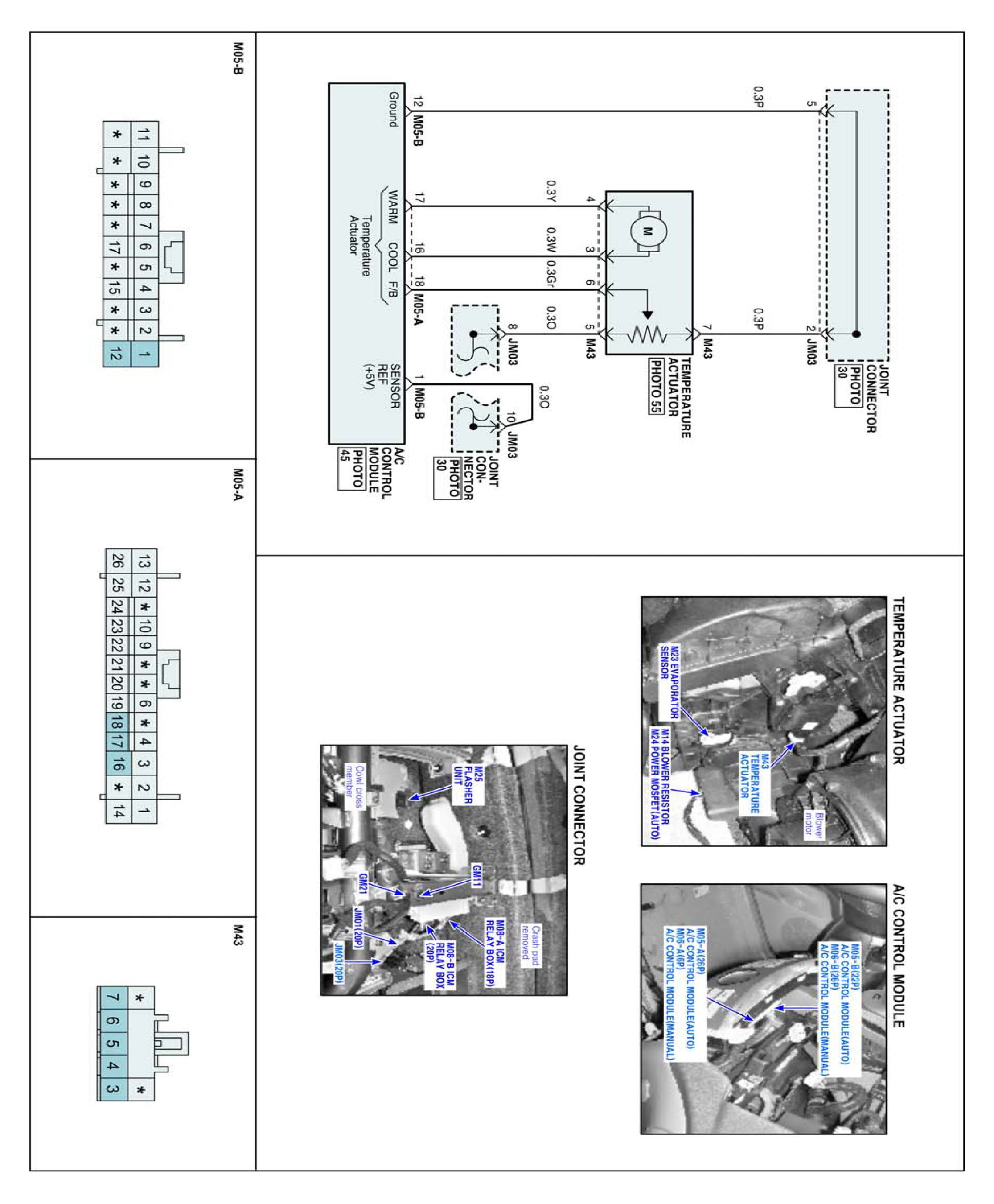 Temperature control actuator located at heater unit. It contains temp motor that changes temp door position and potentiometer that monitors position of temp door. Temperature control actuator regulates the temperature by the procedure as follows. Signal from control unit adjusts position of temp door by operating temp motor and then temperature will be regulated by the hot/cold air ratio decided by position of temp door. In operation, potentiometer delivers temp door position transformed into voltage value to A/C ECU.