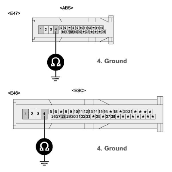 3. Measure resistance between terminal "4" of the HECU harness connector and chassis ground.