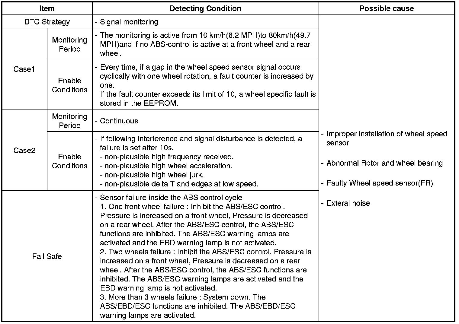 This code is set when an abnormal signal due to air gap problem or an abnormal speed change ratio are detected at the vehicle speed between 10 km/h (6.2 MPH) to 80 km/h (49.7 MPH).