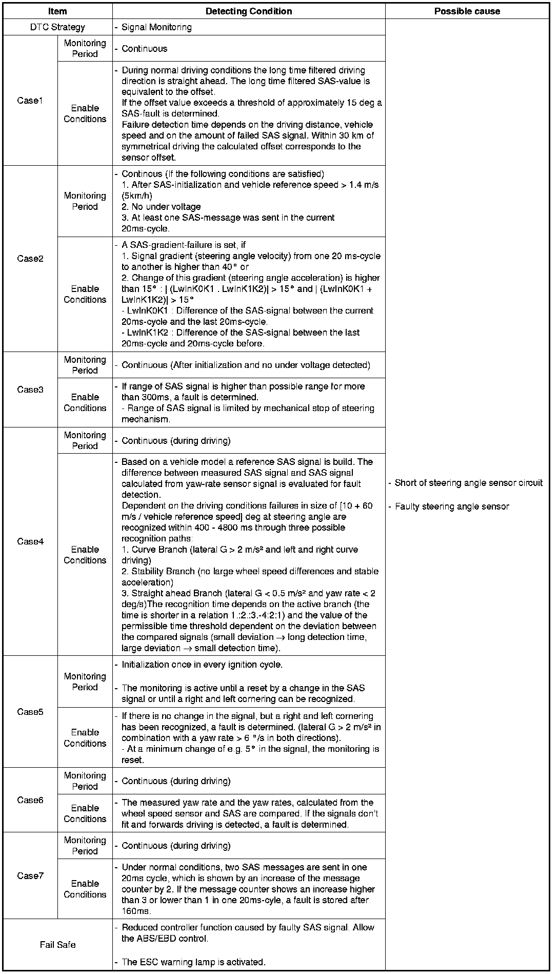 If the SAS signal is different from calculated value by yaw-rate sensor and wheel speed sensor, mechanically impossible SAS signal is detected, there is a difference between SAS signal and driving condition of the vehicle calculated from yaw-rate sensor and lateral G sensor, a failure is detected.