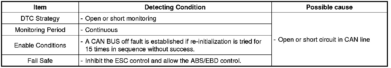 The HECU checks the CAN communication lines for normal ESC control, and sets this code if re-initialization is tried for 15 times in sequence without success.