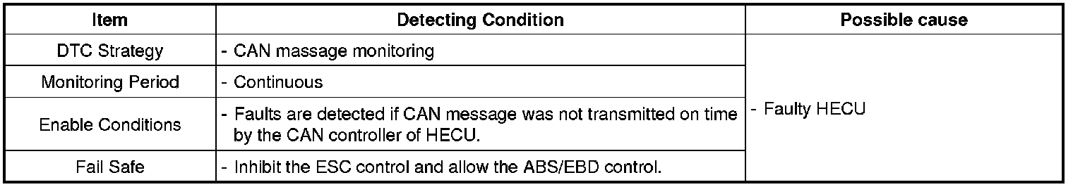 The HECU checks the CAN communication lines for normal ESC control, and sets this code if an CAN message is not transmitted within predefined time.