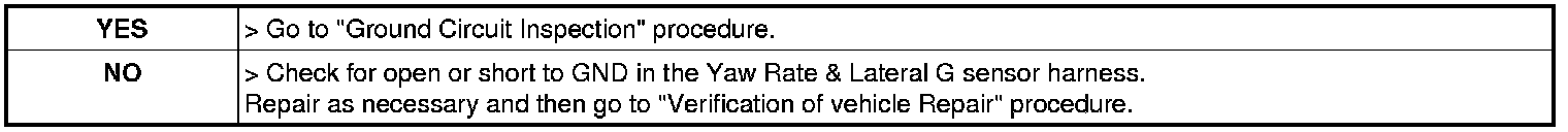 2. Measure voltage between terminal "1" of the Yaw Rate & Lateral G sensor harness connector and chassis ground.