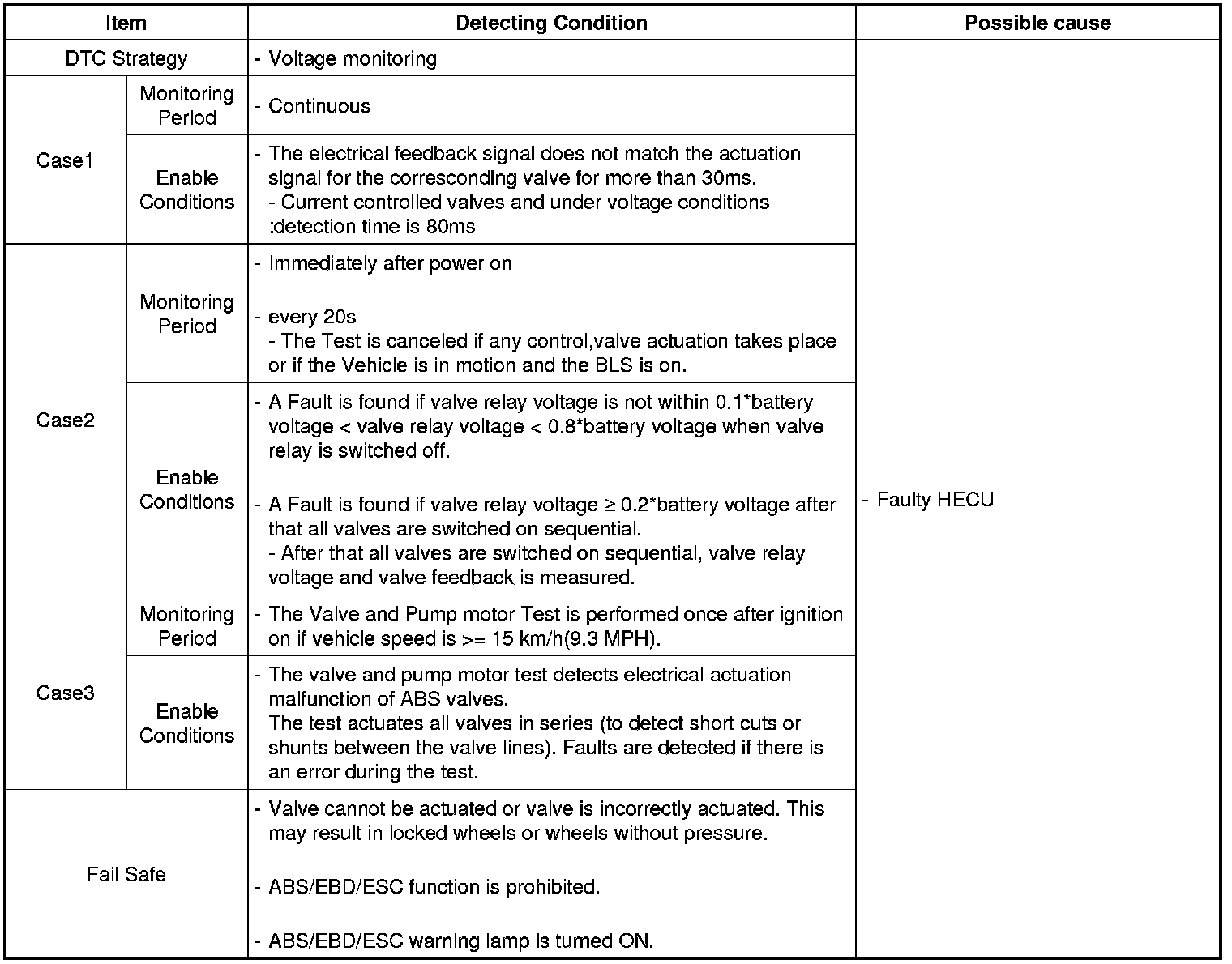 The HECU monitors the operation of the valves by checking the drive circuit of the solenoid valves, and then sets this code when the unexpected drive voltage is detected.