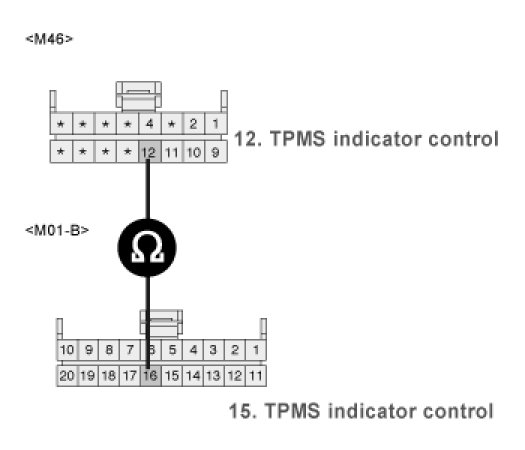 3. Measure resistance between terminal "12" of TPMS receiver harness connector and terminal "14" of instrument cluster harness connector.