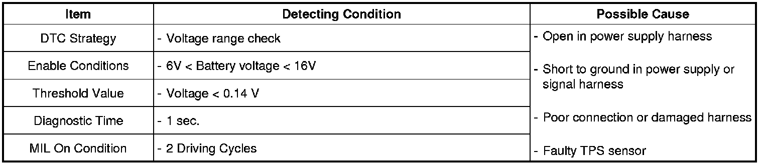 ECM sets DTC P0122 if the ECM detects signal voltage lower than the possible range of a properly operating TPS.