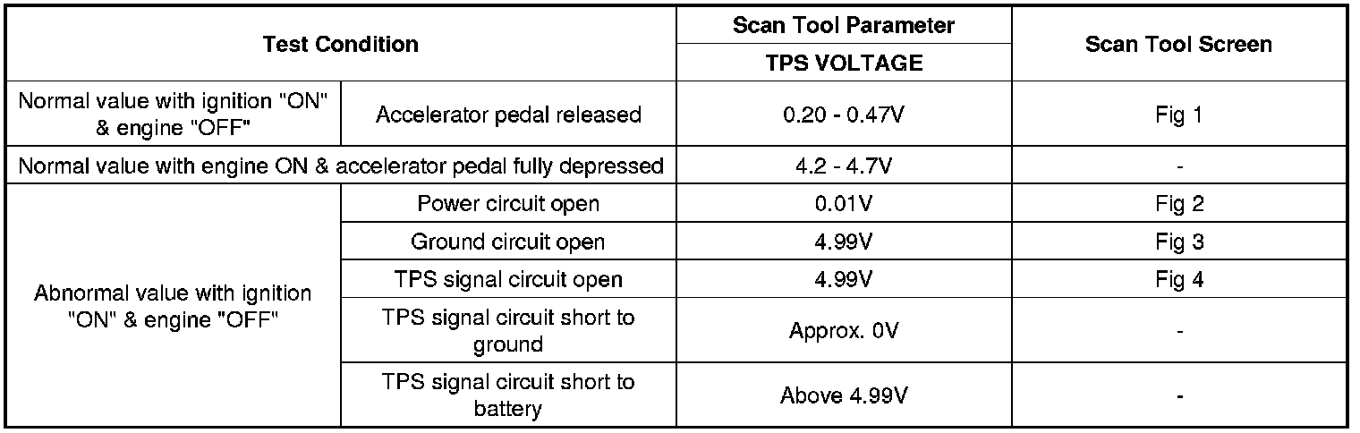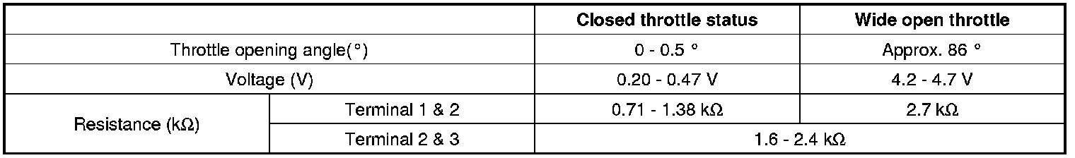 The Throttle Position Sensor (TPS) is mounted on the throttle body and detects the opening angle of the throttle plate. The TPS has a variable resistor (potentiometer) whose characteristic is the resistance changing according to the throttle angle. During acceleration, the TPS resistance between the reference 5 V and the signal terminal decreases and output voltage increases; during deceleration, the TPS resistance increases and TPS output voltage decreases. The PCM supplies a reference 5 V to the TPS and the output voltage increases directly with the opening of the throttle valve. The PCM determines operating conditions such as idle (closed throttle), part load, acceleration/deceleration, and wide-open throttle from the TPS. Also The PCM uses the Mass Air Flow Sensor (MAFS) signal along with the TPS signal to adjust fuel injection duration and ignition timing.