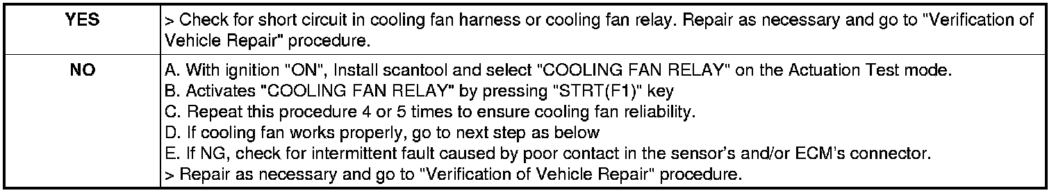 2. Run the cold engine at idle for 5 minutes and observe cooling fan status.