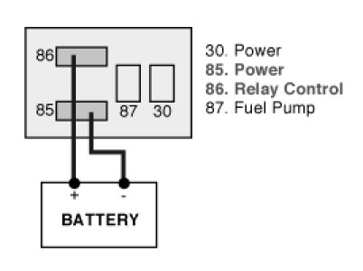 3. Apply 12 V and a ground to 85 and 86 terminals of the fuel pump relay (Components side).