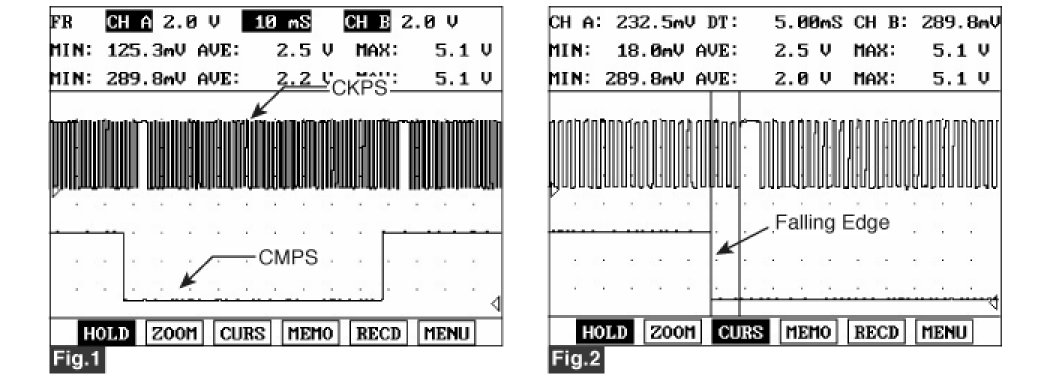 Fig.2,3) The CMPS falling (rising) edge is coincided with 3rd~5th tooth of the CKP from one longer signal (missing tooth)