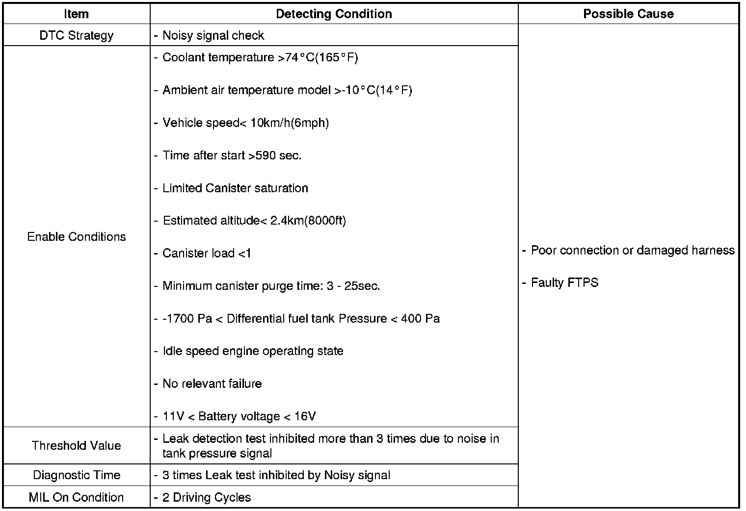 The ECM monitors pressure stability in the fuel tank by means of Fuel Tank Pressure Sensor (FTPS) for predetermined duration just before start the leakage monitoring to detect noise signal of pressure sensor. The ECM sets DTC P0454 if the pressure fluctuation is bigger than predetermined threshold. If same error code is set in the next driving cycle, the ECM illuminates the MIL.