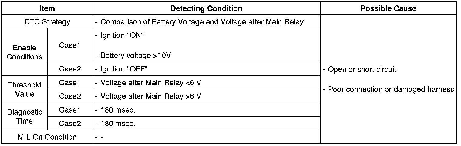 The ECM measures the voltage from ignition key and from main relay respectively and compares two voltages. This comparison will watch if the Main Relay has switched and remains on after ignition Key-On and if it has switched off after the ignition Key-Off. The ECM sets DTC P0560 if the voltage after Main Relay is lower than a predetermined threshold after ignition key-on or higher than a predetermined threshold after ignition key-off.