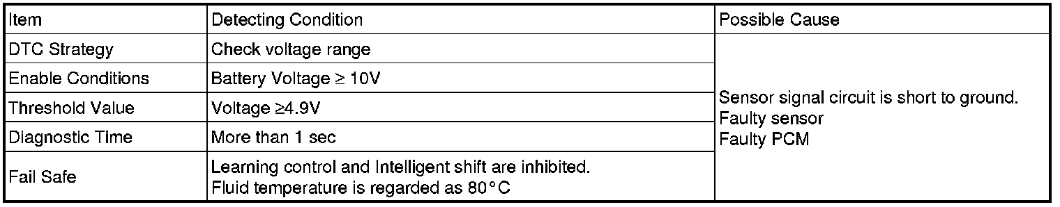 This DTC code is set when the ATF temperature output voltage is higher than a value generated by thermistor resistance, in a normal operating range, for an extended period of time. The TCM regards the ATF temperature as fixed at a value of 80 °C.