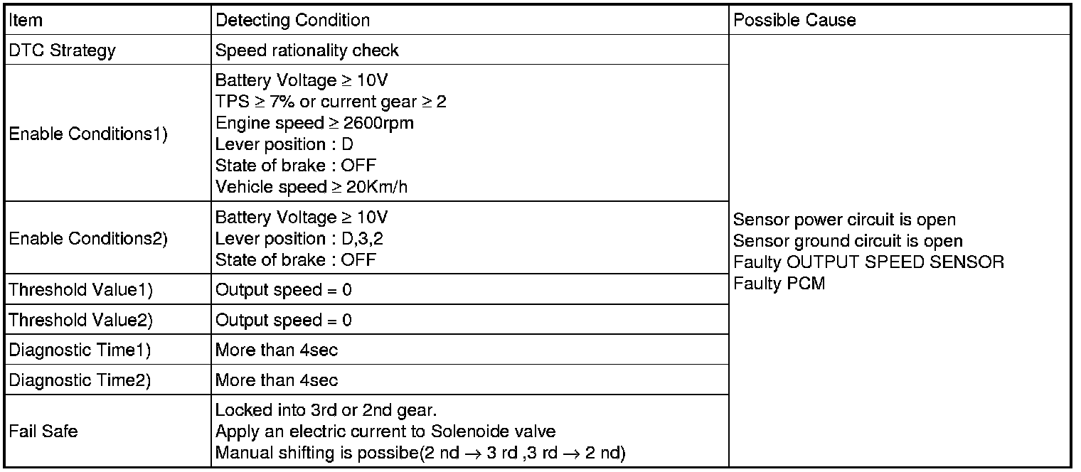 The TCM sets this code if the calculated value of the pulse-signal is noticeably different from the value calculated, using the Vehicle Speed Sensor output, when the vehicle is running faster than 20 km/h. The TCM will initiate the fail safe function if this code is detected.