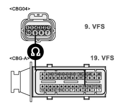3. Measure resistance between terminal "9" of the ATM SOLENOID VALVE harness connector and terminal "19" of the PCM/TCM harness connector.
