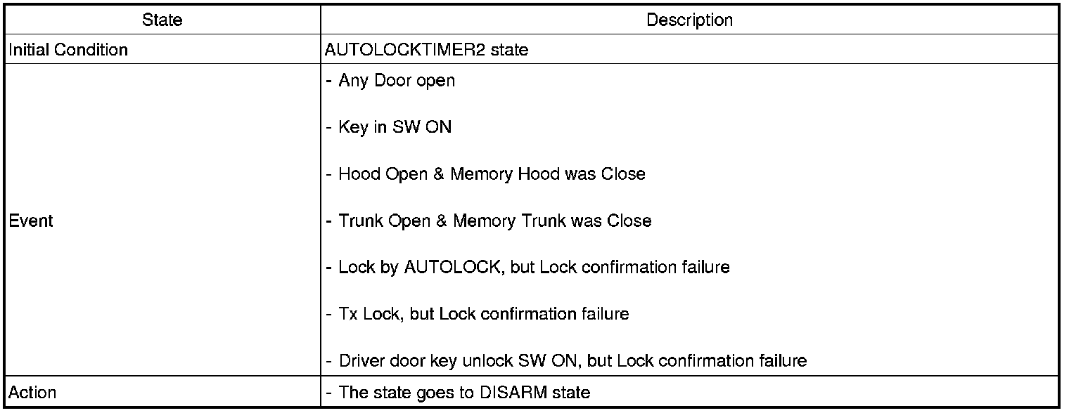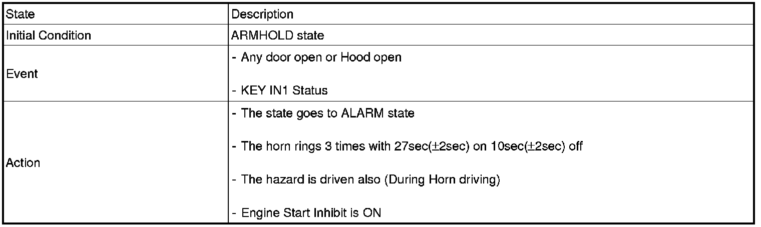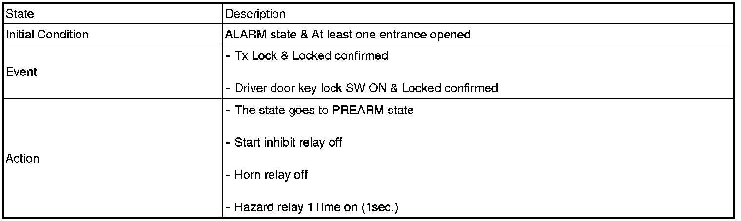 2. PANIC alarm is turned OFF if (TLOCK/UNLOCK/PANIC/TRUNK UNLOCK /KEY IN /DOOR KEY LOCK/DOOR KEY UNLOCK / TRUNK KEY UNLOCK ) signals are received during PANIC alarm.