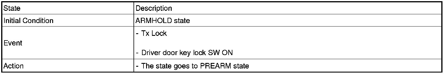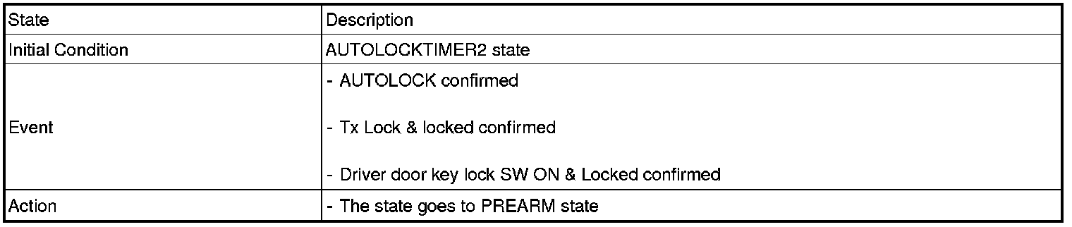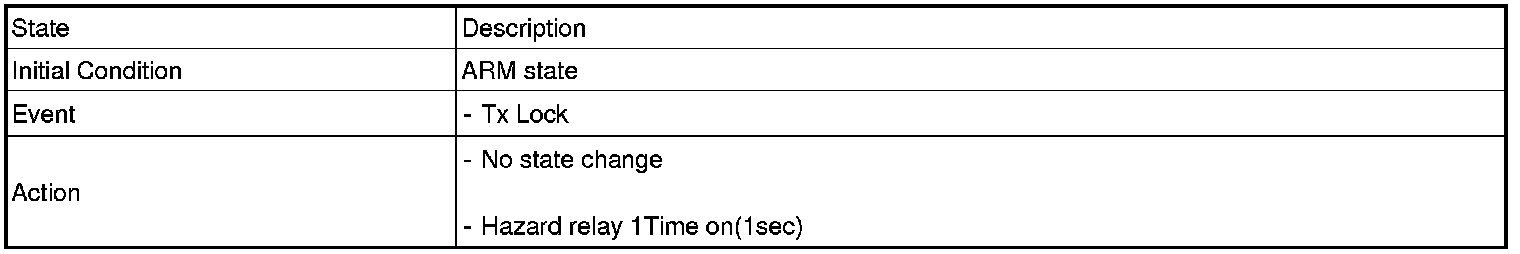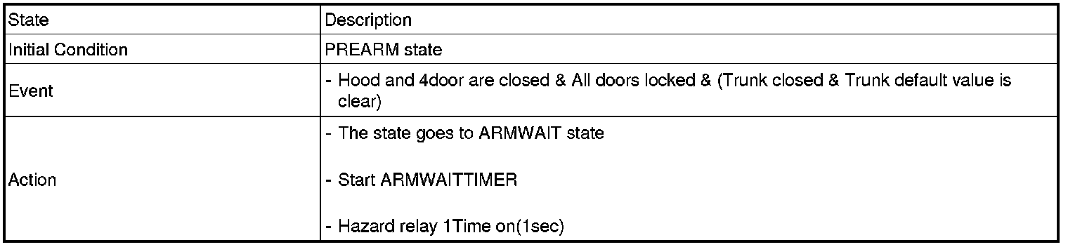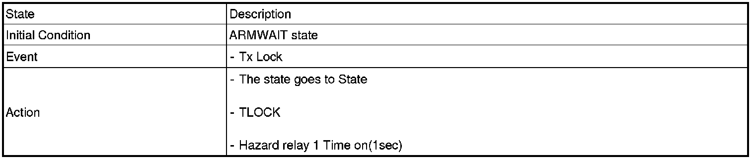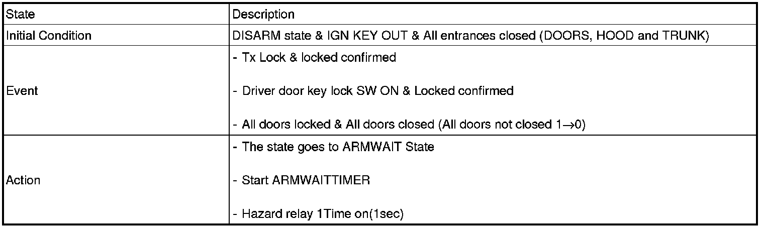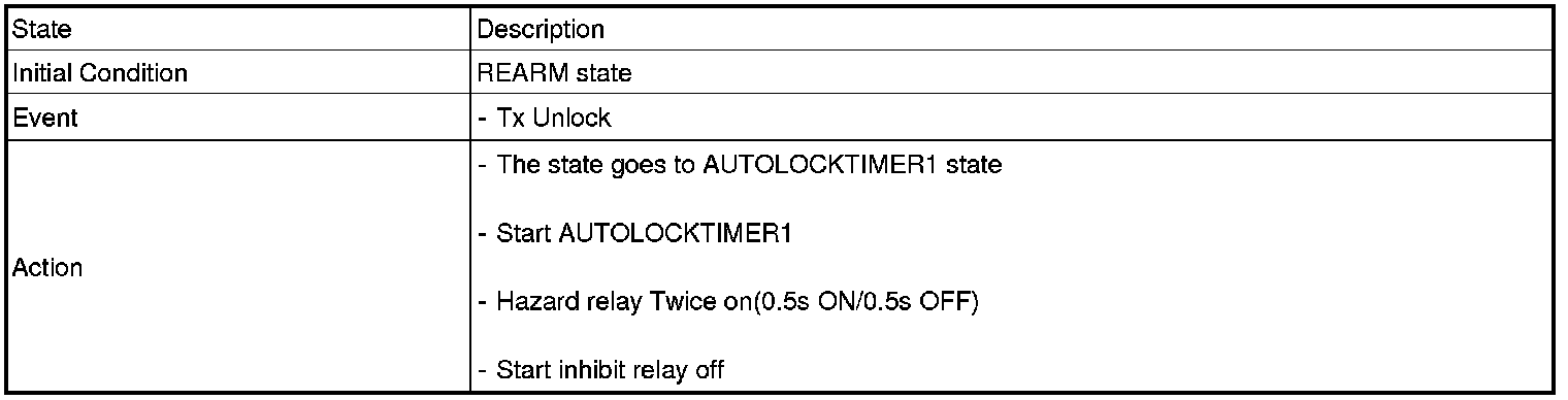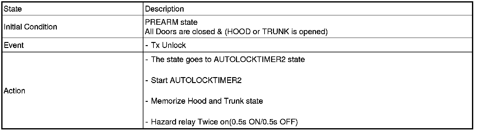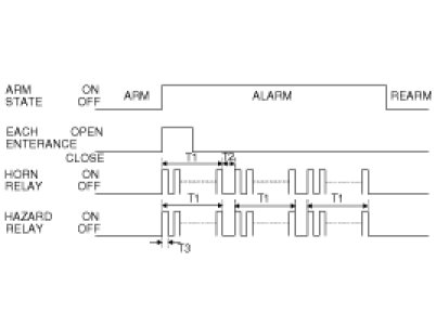 1. Under DOOR, TRUNK or HOOD: Closed, HORN(T2 output), HAZARD(1s-output) signals are output if TLOCK signal is received again within T1 from the moment when the mode transits to ARM mode by TLOCK operation and ARM mode is kept.