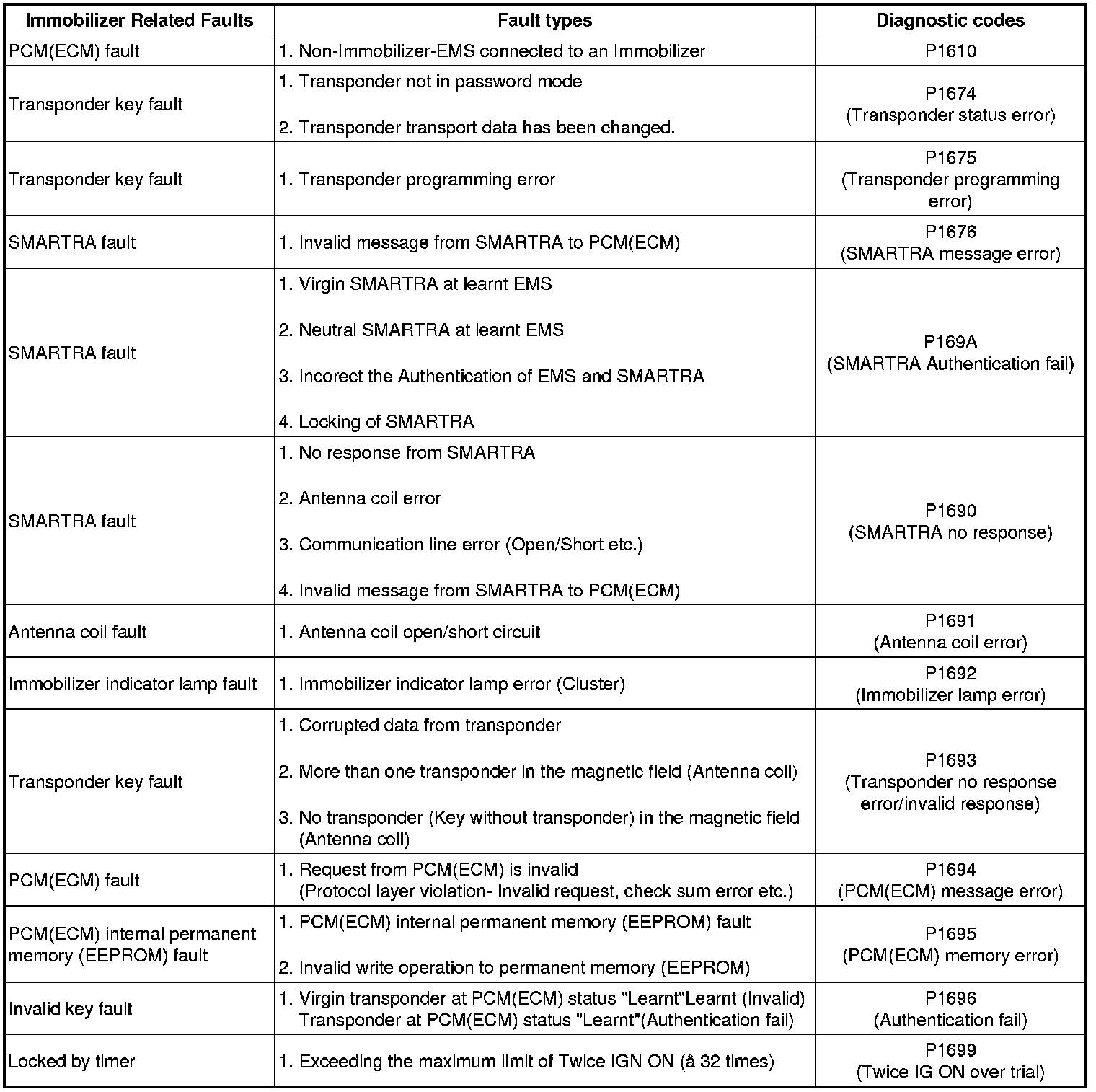 The following table shows the assignment of immobilizer related faults to each type:
