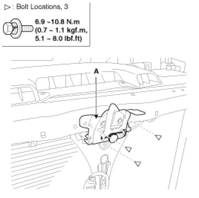3. Remove the hood latch (A) mounting bolts.
