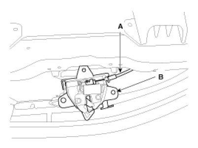 4. Disconnect the hood latch cable (A) and remove the latch (B).