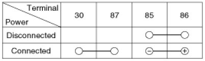 2. There should be continuity between the No.30 and No.87 terminals when power and ground are connected to the No.85 and No.86 terminals.