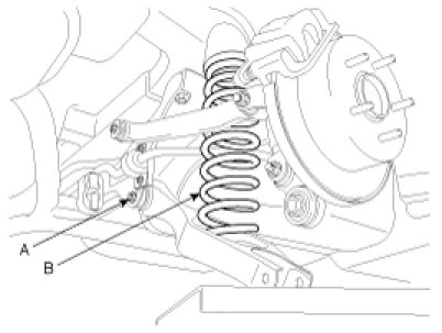 8. Install the coil spring (A) on the rear lower arm (B), then slowly jack-up the rear lower arm (B) by using jack.