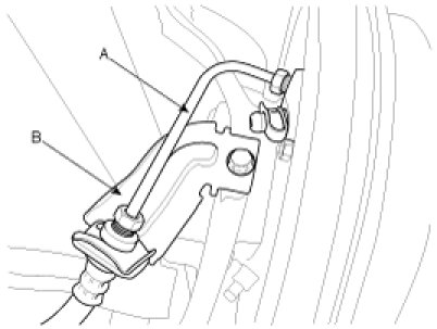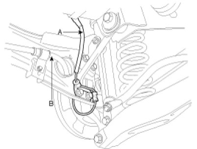 8. Install the wheel speed sensor (A) and parking brake cable (B).