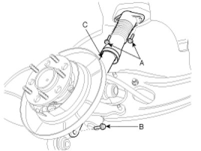 10. Remove the rear strut assembly (C) after loosen the bolt (A, B).
