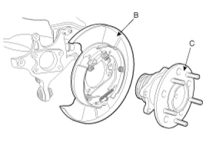14. Remove the rear hub assembly (C) and rear brake assembly (B) after remove mounting bolts (A).