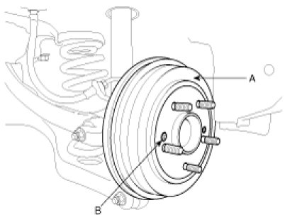 5. Install the rear brake drum assembly (A) and tighten the screw (B).
