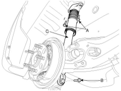 9. Remove the rear strut assembly (C) after loosen the bolt (A, B).