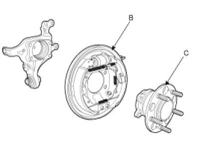 1. Install the rear hub assembly (C) and rear brake assembly (B) to the rear carrier, then tighten mounting bolts (A).