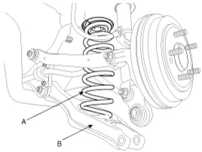 5. Loosen the mounting nut (A) of the cross member and the rear lower arm, then remove the coil spring (B) by taking down the jack.