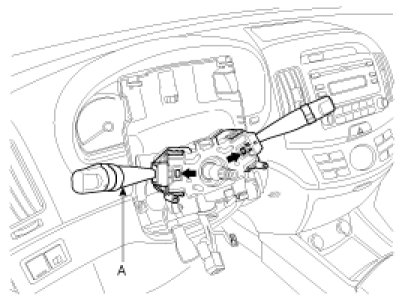 9. Remove the multifunction switches (A) from the steering column with the portion indicated by the arrow pressed.
