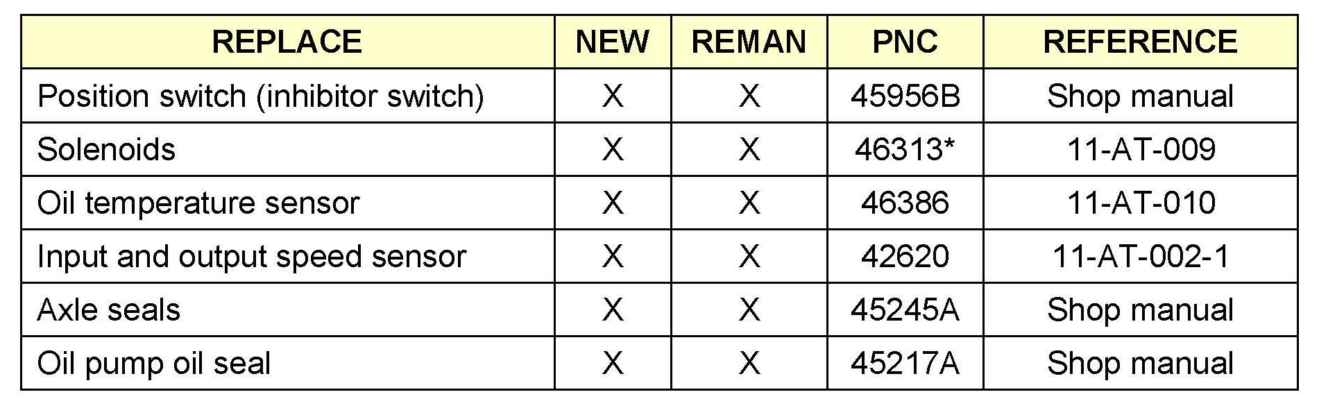The automatic transaxle warranty repair policy authorizes in-dealership repairs of the following components for both OEM (new) and remanufactured automatic transaxles: