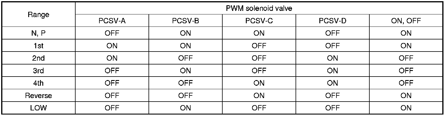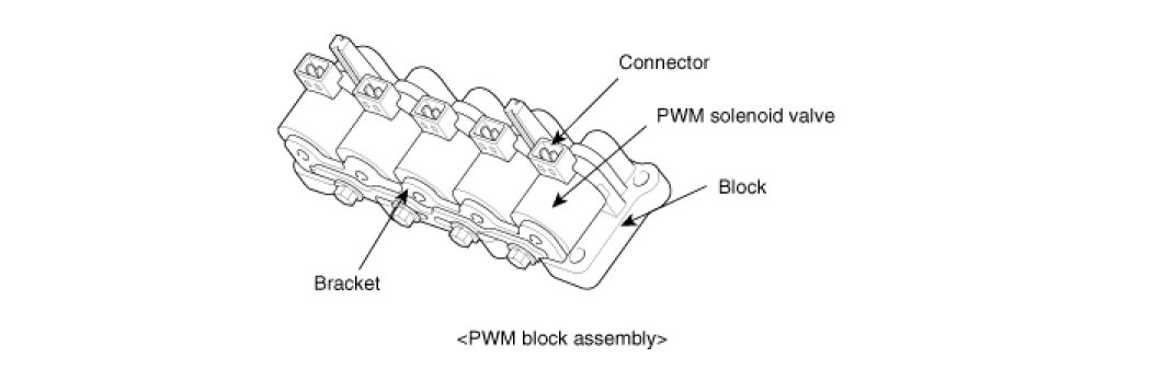 PWM solenoid valve is composed of five solenoid valves and the oil capacity in the solenoid valve is changed by the electric duty value of TCM. The oil pressure of the valve body and the torque converter engages or disengages the damper clutch. The solenoid valves send the operating oil pressure to the clutches and brakes at the each range and also control the strength and weakness of oil pressure to reduce the shock when shifting the range.