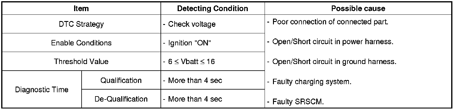 The SRSCM sets DTC B1102 and turns warning light on if voltage below threshold value is detected for more than 4 sec. (If voltage within threshold value is detected for 4 sec. SRSCM regards DTC as being cleared and turns warning light off).