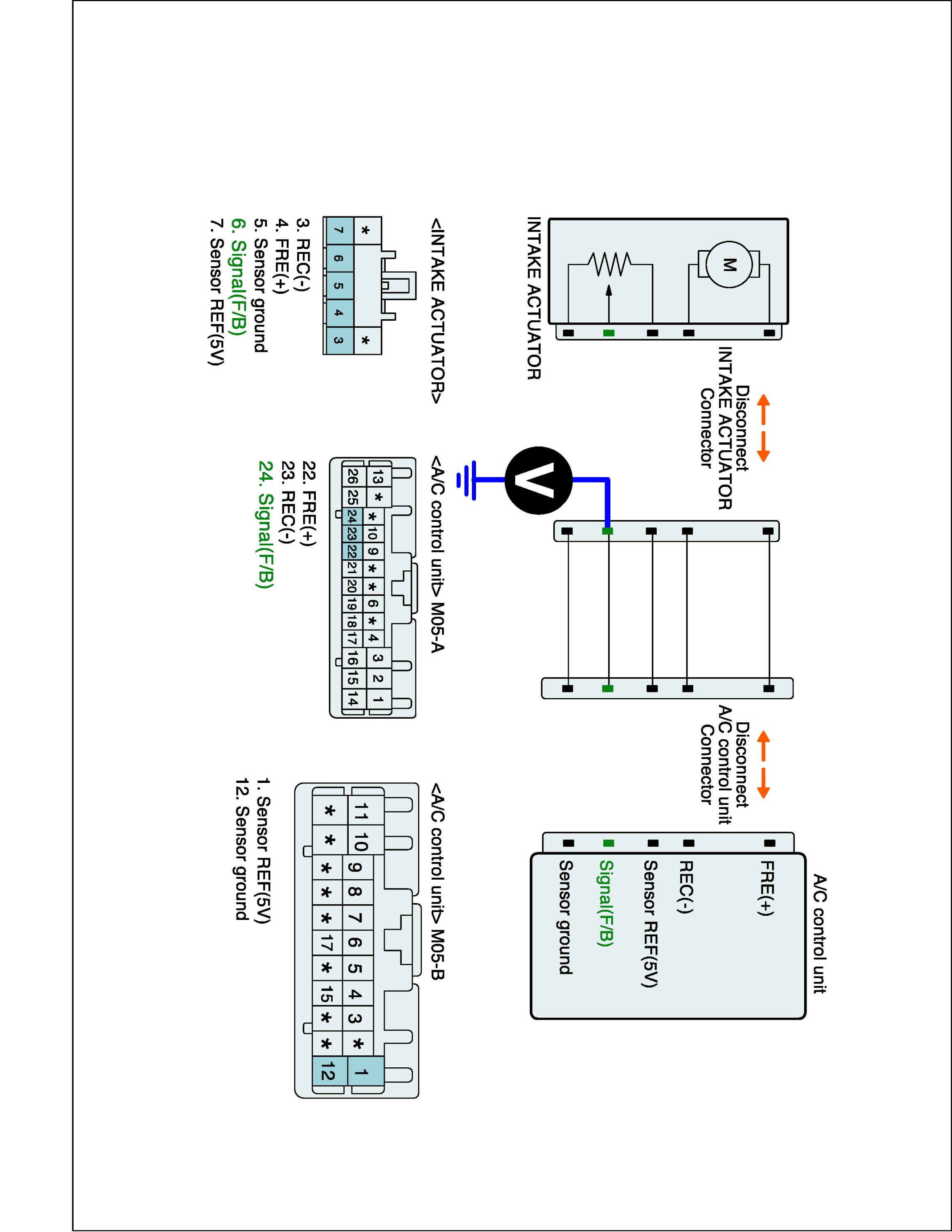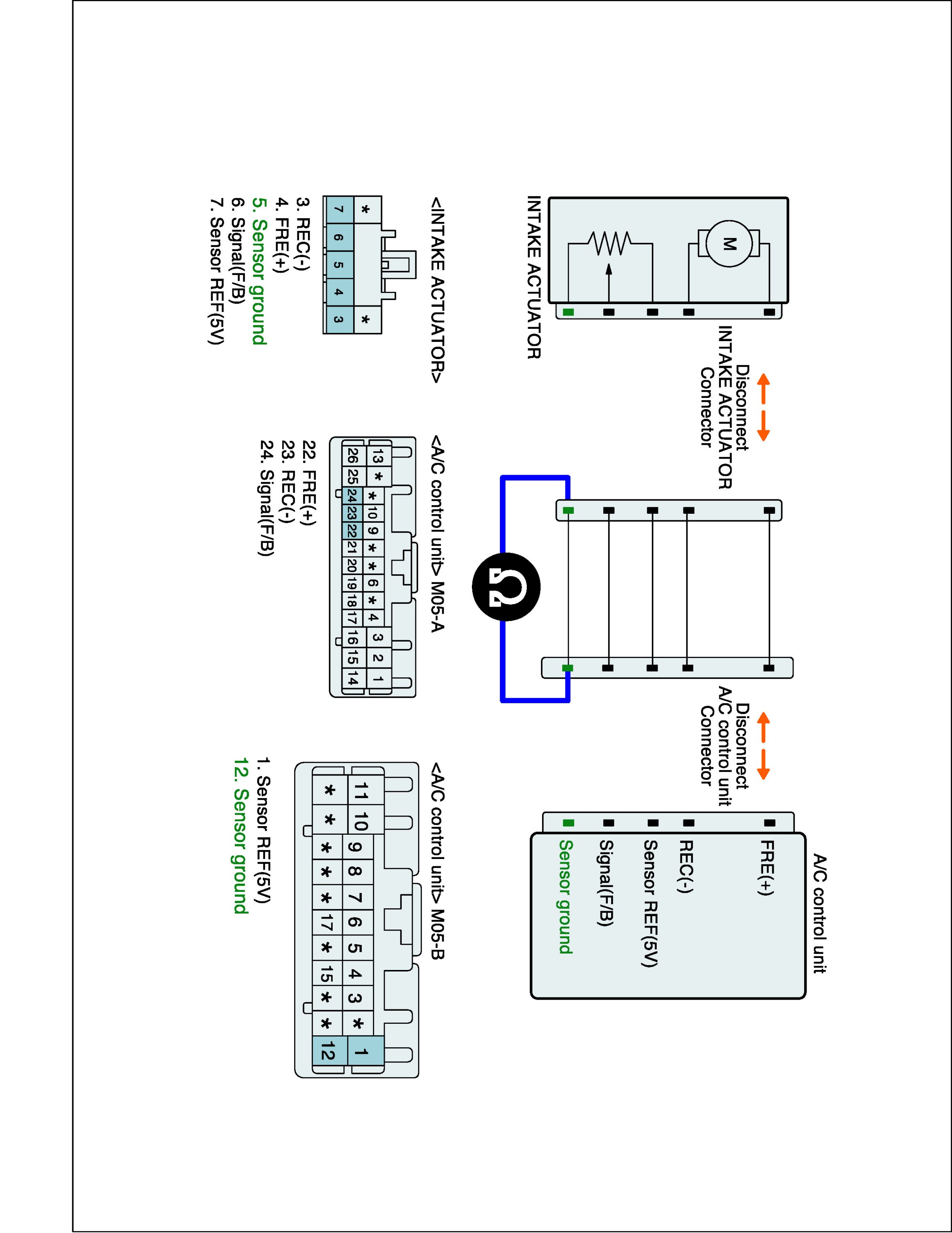 3. Measure resistance between Sensor ground (-) terminal of Intake actuator harness connector and Sensor ground (-) terminal of A/C-ECU harness connector.
