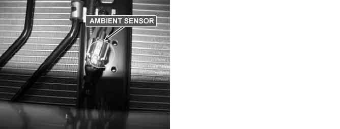 The ambient temperature sensor located at the center stay of the condenser detects ambient air temperature. It is a negative type thermistor whose resistance is inversely proportional to temperature. Its output is used for sensor fail-safe, temperature regulation door lock, blower motor level control, mix mode control and in-car humidity control.