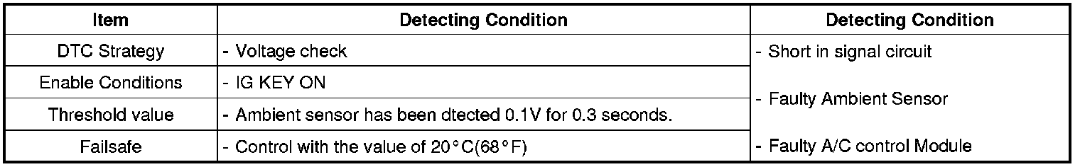 Air conditioner Control Module sets DTC B1237 if Ambient sensor has been detected below 0.1 V for 0.3 seconds.