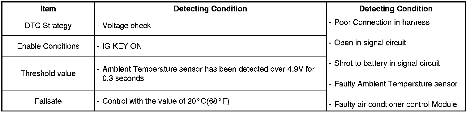 Air conditioner Control Module sets DTC B1238 if Ambient sensor has been detected over 4.9 V for 0.3 seconds.