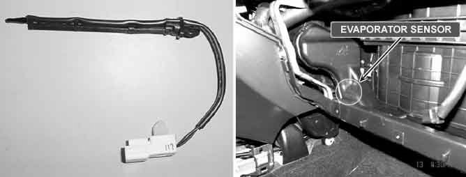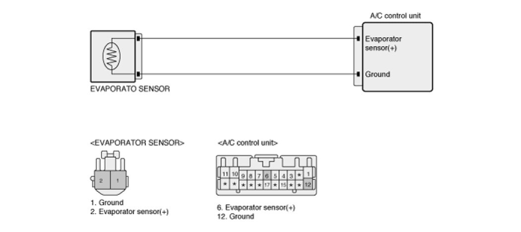 The Evaporator sensor located on heater unit detects the core temperature. It is a negative type thermistor whose resistance is inversely proportional to temperature. Evaporator sensor transforms measured temperature into voltage value and delivers it to A/C ECU. when core temperature is blow threshold value, A/C ECU interrupts compressor relay power, in order to prevent evaporator freezing by excessive cooling.