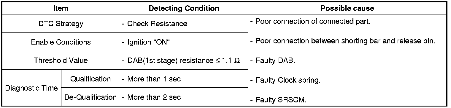 The SRSCM sets DTC B1347 if the measured resistance value of DAB circuit is less than the threshold value (1.0 Ohms)