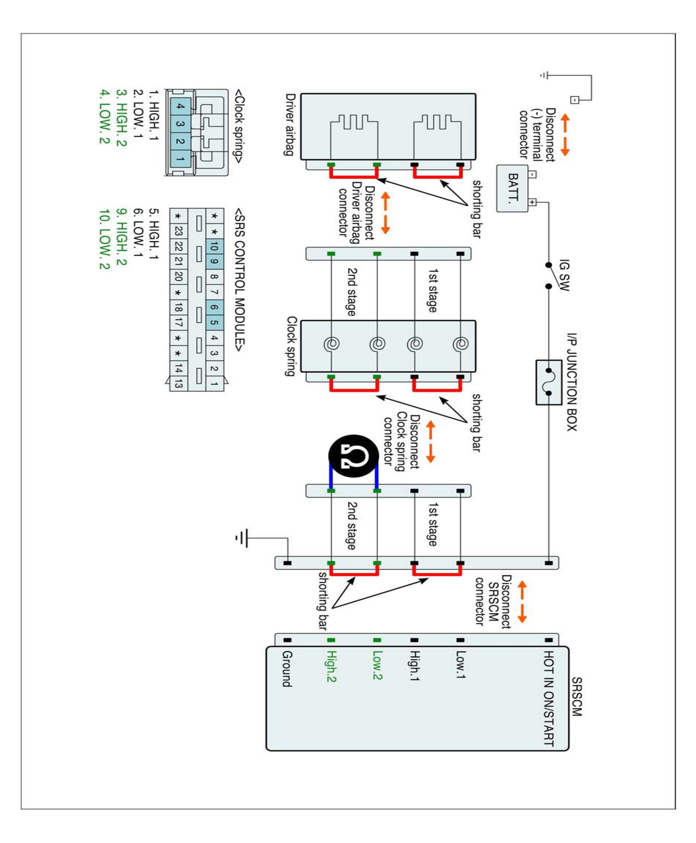4. Measure resistance between terminal "Low.2" and "High.2" of the Clock Spring harness connector.