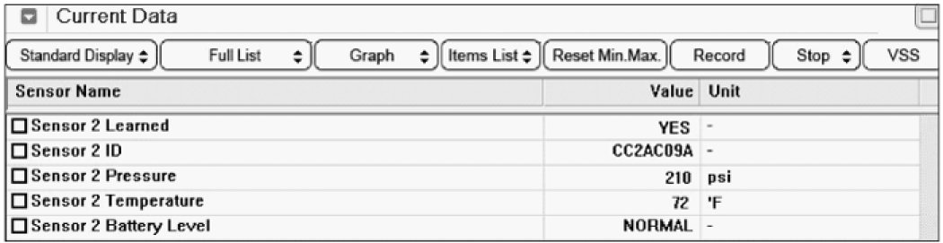 4. Monitor the "BATTERY VOLTAGE" of TPMS sensor on the scantool.